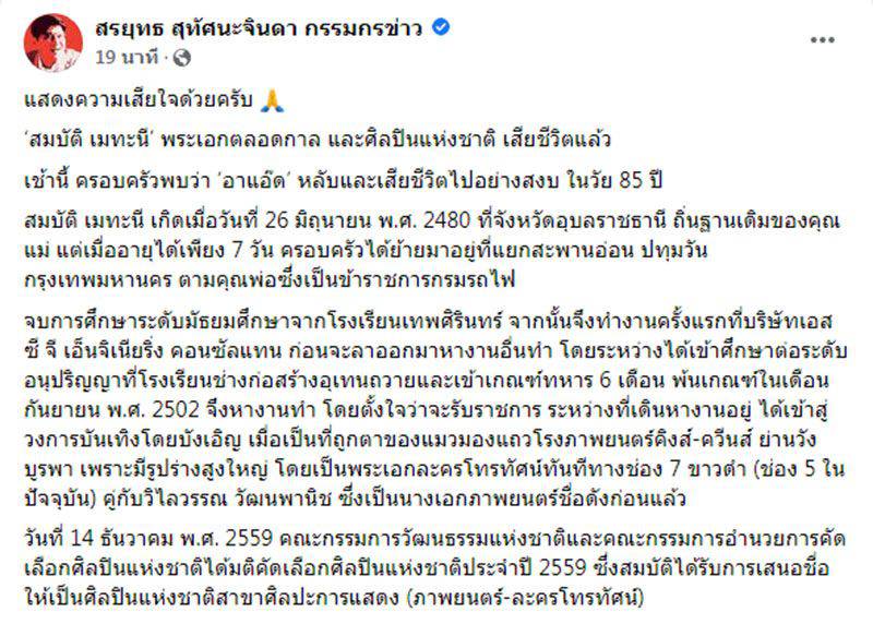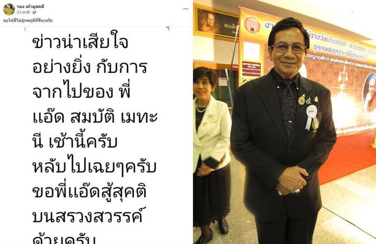 ขณะที่เพจดังอย่าง “สรยุทธ สุทัศนะจินดา กรรมกรข่าว” ได้โพสต์ภาพเก่าของ “สมบัติ เมทะนี” พร้อมระบุข้อความว่า แสดงความเสียใจด้วยครับ‘สมบัติ เมทะนี’ พระเอกตลอดกาล และศิลปินแห่งชาติ เสียชีวิตแล้ว เช้านี้ ครอบครัวพบว่า ‘อาแอ๊ด’ หลับและเสียชีวิตไปอย่างสงบ ในวัย 85 ปีทางด้านรอง เค้ามูลคดี โพสต์ขอพี่แอ๊ดสู่สุคติบนสรวงสวรรค์ สุดเศร้าอาลัย สมบัติ เมทะนี พระเอกดังตลอดกาล เสียชีวิตแล้ว โดยระบุว่า “ขอให้พี่ไปสู่ภพภูมิที่ดีนะครับ” “ข่าวน่าเสียใจอย่างยิ่ง กับการจากไปของพี่แอ๊ด สมบัติ เมทะนี เช้านี้ครับ หลับไปเฉยๆครับ ขอพี่แอ๊ดสู่สุคติบนสรวงสวรรค์ด้วยครับ”