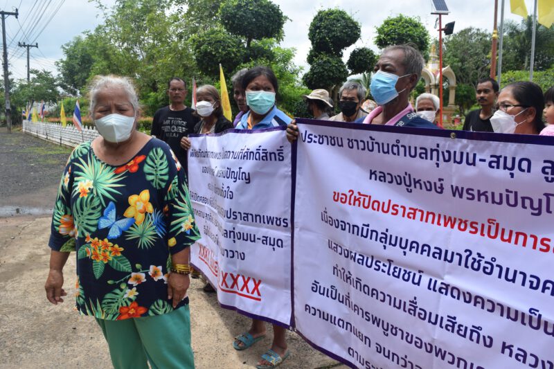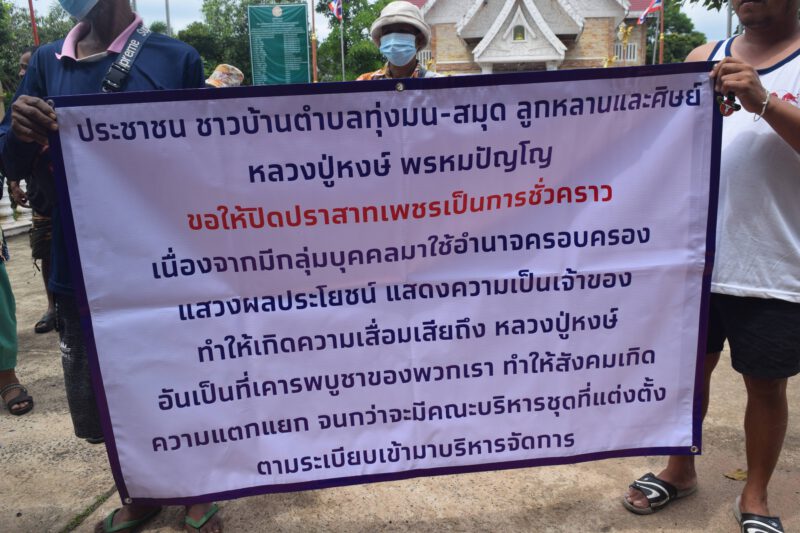 เมื่อเวลา 09.30 น.วันที่ 7 กันยายน 2565 ผู้สื่อข่าวพบชาวบ้านกว่า 20 คน รวมตัวกันถือป้ายขอให้ปิดปราสาทเพชรเป็นการชั่วคราว เนื่องจากมีกลุ่มบุคคลมาใช้อำนาจครอบครอง แสวงผลประโยชน์ พร้อมทั้งตะโกนให้เปลี่ยนคณะกรรมการวัดใหม่และคัดค้านการทำถนนวางท่อเข้าจอดรถ ซึ่งเป็นทางเข้าพิพิธภัณฑ์ปราสาทเพชรนั้น จะมีป้ายติดไว้ว่าให้รถยนต์เข้ามาจอดหน้าปราสาทได้จึงทำให้ถนนเข้าไปชำรุดแตกร้าวเป็นทางยาวกว่า 10เมตร พร้อมกันนี้ยังจะทำถนนและวางท่อระบายน้ำข้างสะพาน ซึ่งเป็นที่ไม่พอใจกับชาวบ้านชาวชุมชนเป็นอย่างมาก ชาวบ้านจึงรวมตัวกันถือป้ายมีข้อความว่า ”ประชาชน ชาวบ้านตำบลทุ่งมน-สมุด ลูกหลานและศิษย์ หลวงปู่หงษ์ พรหมปัญโญ ขอให้ปิดปราสาทเพชรเป็นการชั่วคราว เนื่องจากมีกลุ่มบุคคลมาใช้อำนาจครอบครอง แสวงผลประโยชน์ แสดงความเป็นเจ้าของ ทำให้เกิดความเสื่อมเสียถึง หลวงปู่หงษ์ อันเป็นที่เคารพบูชาของพวกเรา ทำให้สังคมเกิด ความแตกแยก จนกว่าจะมีคณะบริหารชุดที่แต่งตั้ง ตามระเบียบเข้ามาบริหารจัดการ”